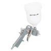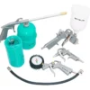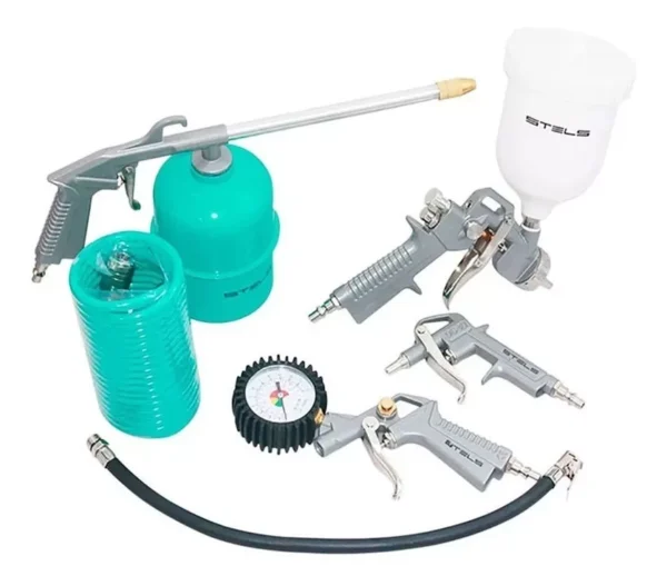 Composto por pistola pneumática com tanque baixo de alumínio, pistola para limpeza, mangueira de ar espiral, calibrador de pneus com manômetro e pulverizador pneumático com bico longo e tanque baixo.